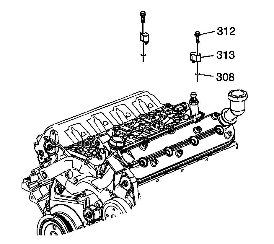 7. Remove the engine coolant air bleed cover bolts (312).