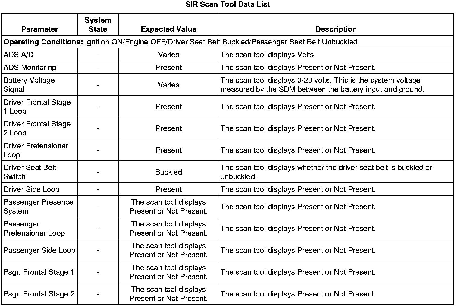 Use the SIR scan tool data list as directed by a diagnostic table or in order to supplement the diagnostic procedures. Begin all of the diagnostic procedures with the Diagnostic System Check - Vehicle (Initial Inspection and Diagnostic Overview). Use the Scan Tool Data Lists after the following is determined: