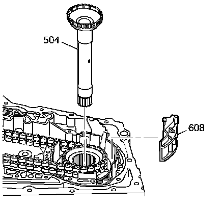 3. Install the fourth clutch shaft assembly (504) into the case through the driven sprocket. The fourth clutch shaft assembly (504) must fully seat into the input sun gear.