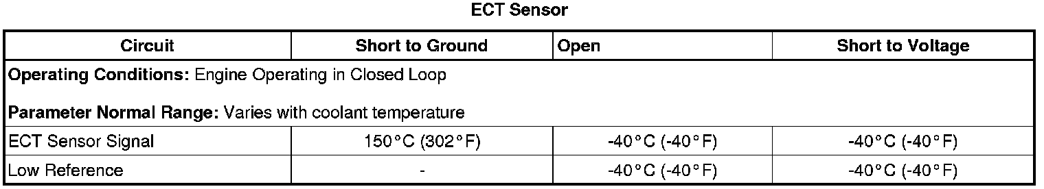 The ECM detects that the ECT sensor parameter is colder than -39°C (-38°F) for greater than 5 seconds.