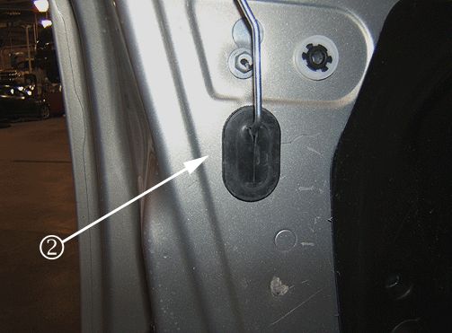 2. Locate the lock rod grommet in the door inner panel (1). Remove the original type grommet and install the revised grommet (2).