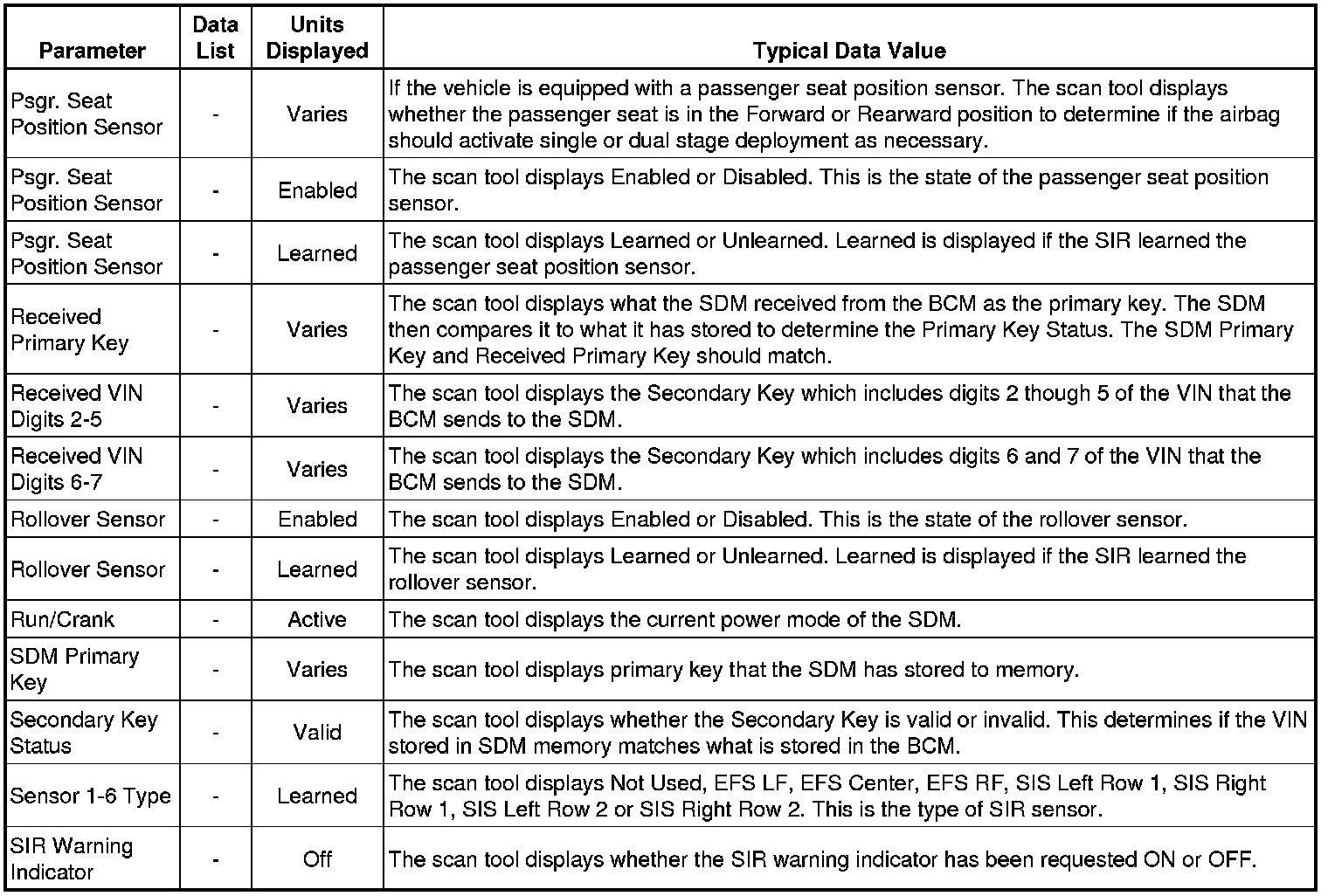 The SIR scan tool data list and PPS scan tool data list contain the restraint system related parameters that are available on the scan tool. The column, Data List, indicates the location of the parameter within the scan tool menu selections.