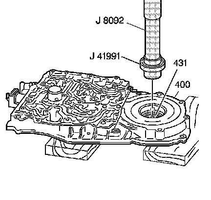 3. Using the assembled tool, press the drive shaft bearing assembly (431) from the case cover (400).