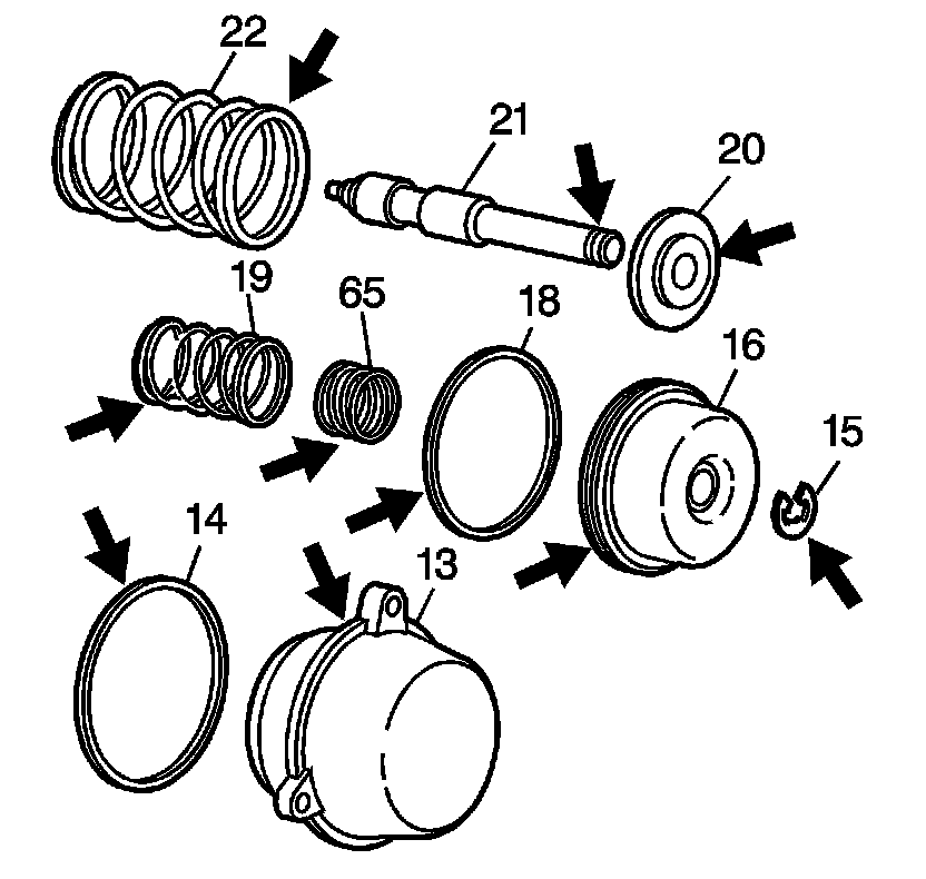 2. Assemble the servo piston (16), the servo piston cushion outer spring (19), the servo piston cushion inner spring (65), the servo cushion spring retainer (20) and the servo piston apply pin (21).