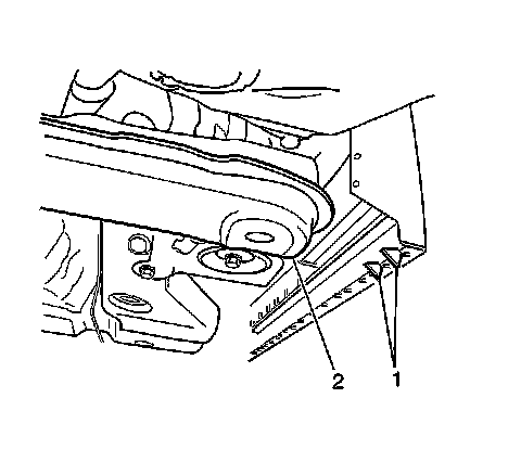 Position the pads under the body side rocker pinch welds (1) or the rear crossmember support (2).