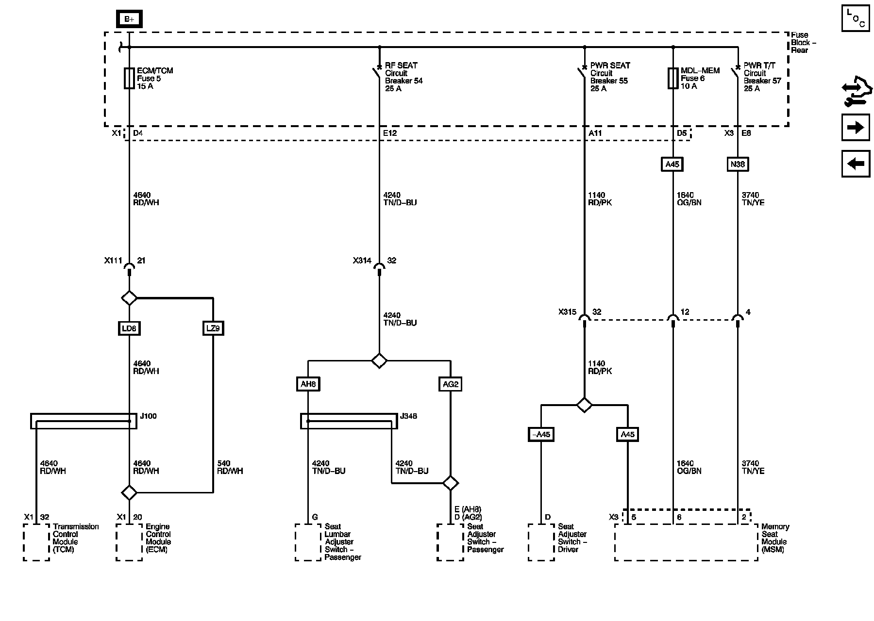 MSM/RT FRT PWR SEAT, MSM/LT FRT PWR SEAT, MSM Circuit Breakers, ECM/TCM, MSM LOGIC/RF MASSAGE Fuses