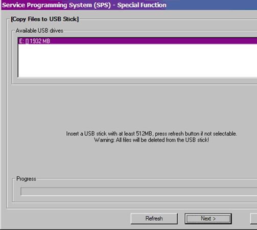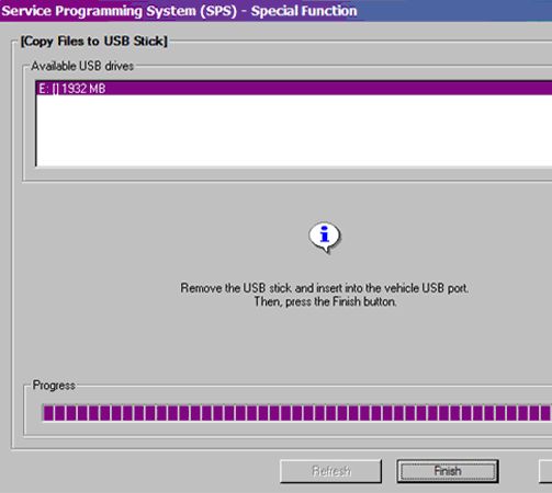 The files have been successfully loaded onto the USB flash drive when the Progress Status bar is completely shaded and the SPS Special Functions screen displays the following message: "Remove the USB stick and insert into the vehicle USB port."