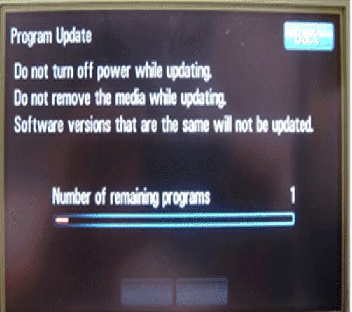14. After the USB programming has completed, the screen will go blank. (On the SRX, the screen will also lower.) It is not necessary to observe the entire programming process. Once the screen has gone blank, a white outline bar graph will appear. (Not visible on SRX due to the screen being lowered.) The downloaded program will automatically install. Once this progress bar fills, the screen will go blank and USB programming will be complete.