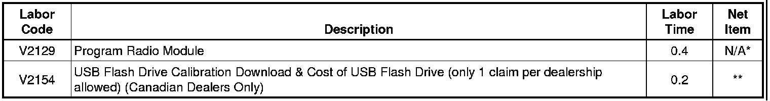** Submit the actual cost of the USB 2.0 Flash Drive, not to exceed $10.00 USD, $10.30 CAD. The calibration downloaded to the USB Flash Drive can be used to program all vehicles involved in the field action. After completing the programming event for all vehicles involved in the field action, remove (delete) the calibration from the USB Flash Drive. Save the USB Flash Drive for future USB programming events.