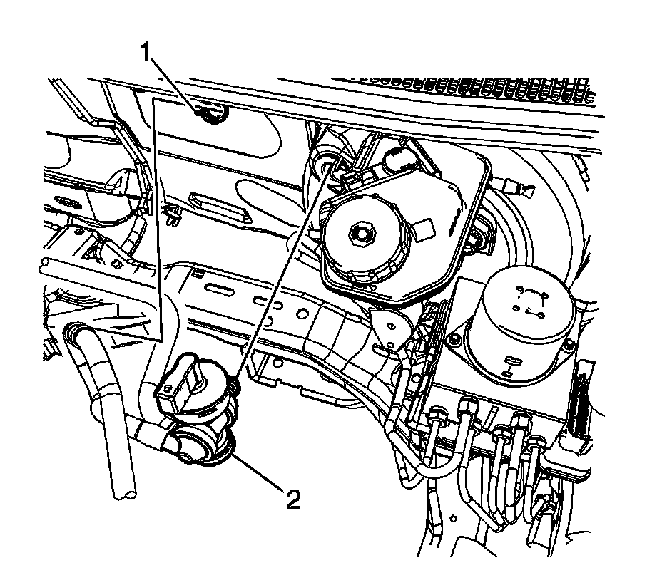 6. Remove the power brake booster vacuum rear pipe and power brake booster vacuum sensor (2) from the power vacuum brake booster.