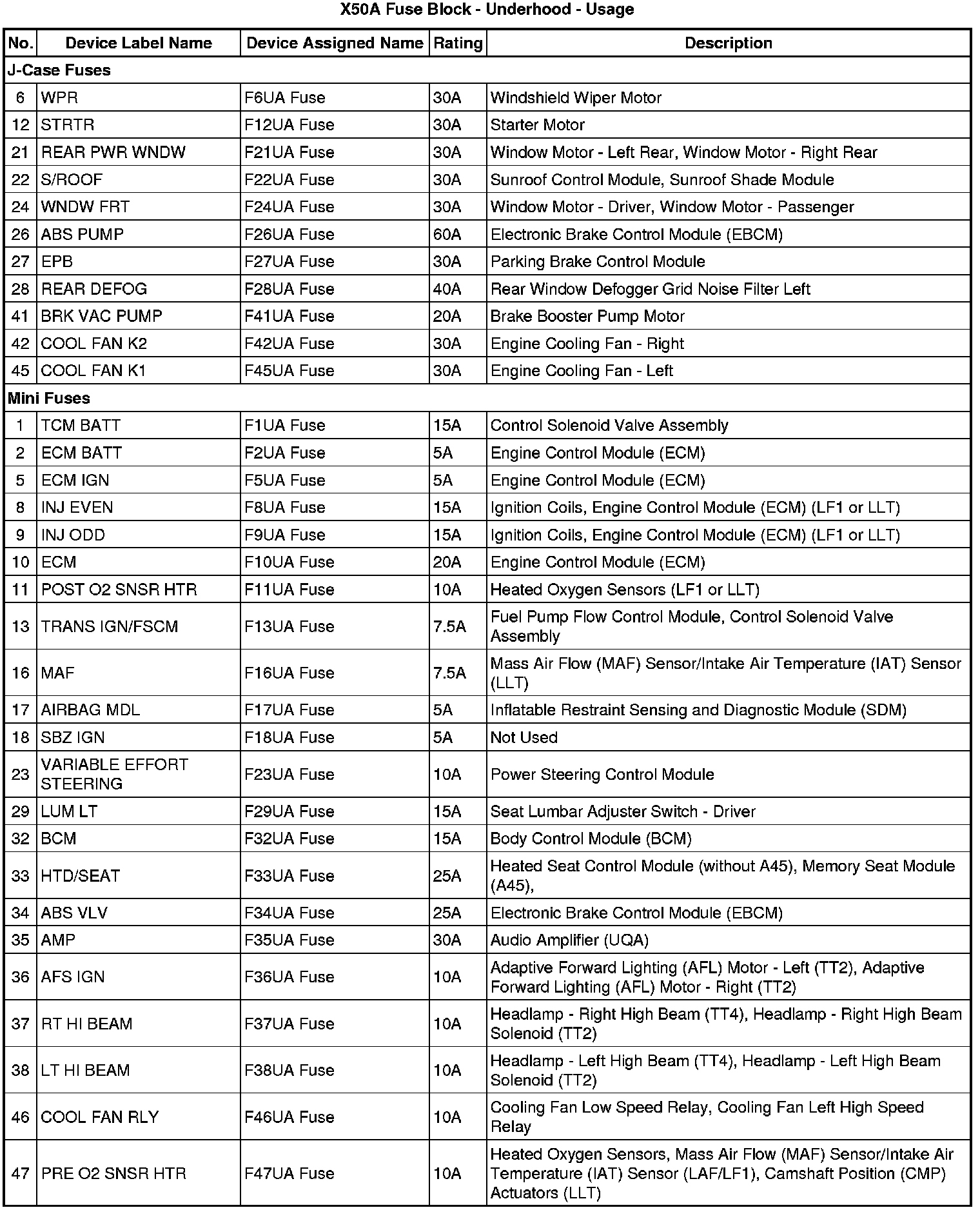 X50A Fuse Block - Underhood - Label