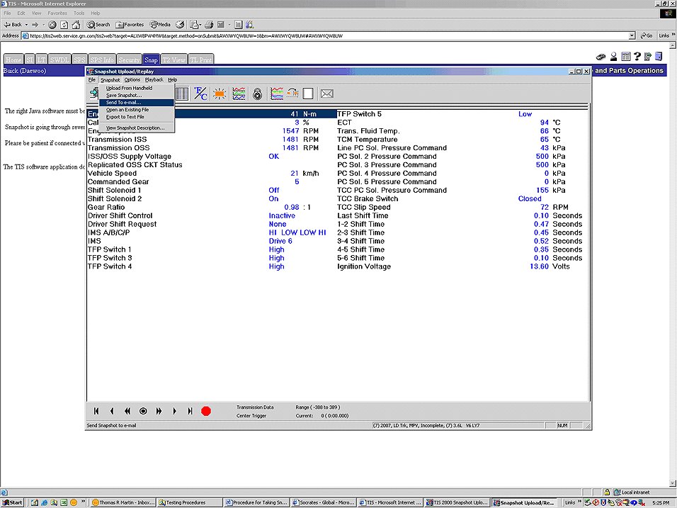 4. Once communication is established and you select the file you want to upload, you will see a screen similar to below. You can email the file directly from TIS2WEB by going to the Snapshot drop down menu and selecting "Send to e-mail" as shown in Figure 11.