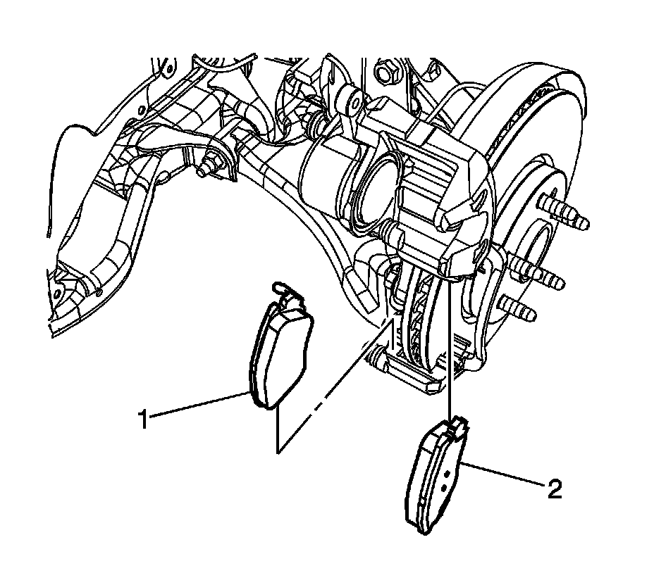 2. Install the inner brake pad (1) and the outer brake pad (2).