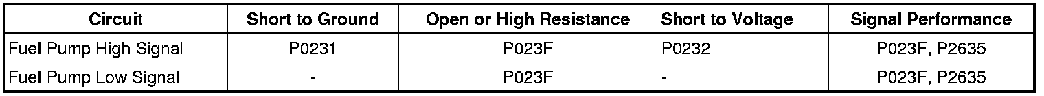 The engine control module (ECM) supplies voltage to the fuel pump control module when the ECM detects that the ignition is on. The voltage from the ECM to the fuel pump control module remains active for two seconds, unless the engine is in crank or run. While this voltage is being received, the fuel pump control module closes the ground switch of the fuel pump and also supplies a varying voltage to the fuel tank pump module in order to maintain the desired fuel rail pressure.