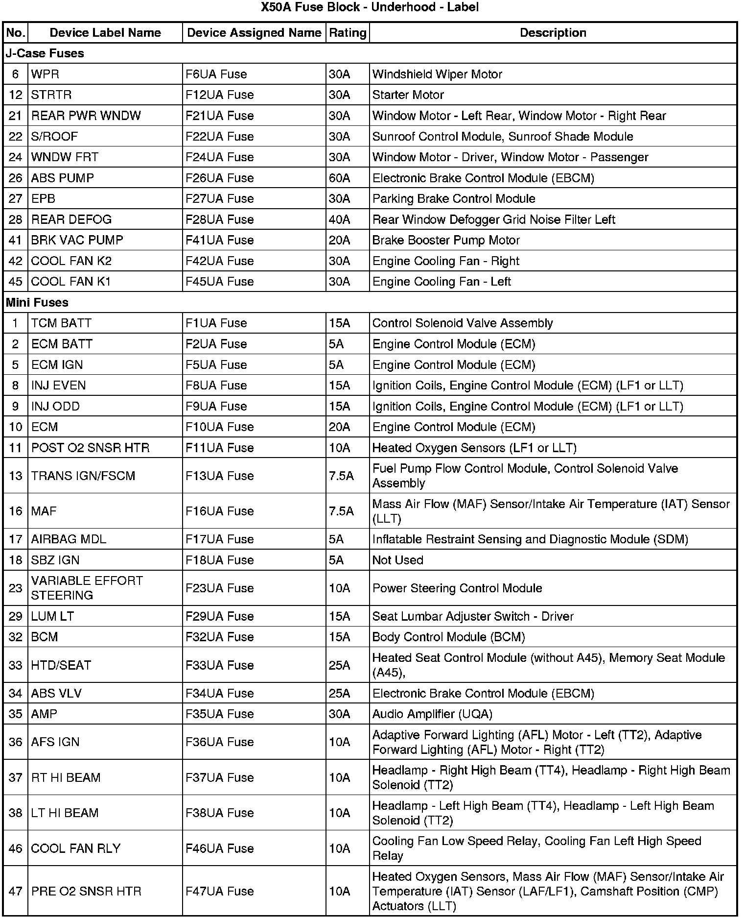 X50A Fuse Block - Underhood - Label