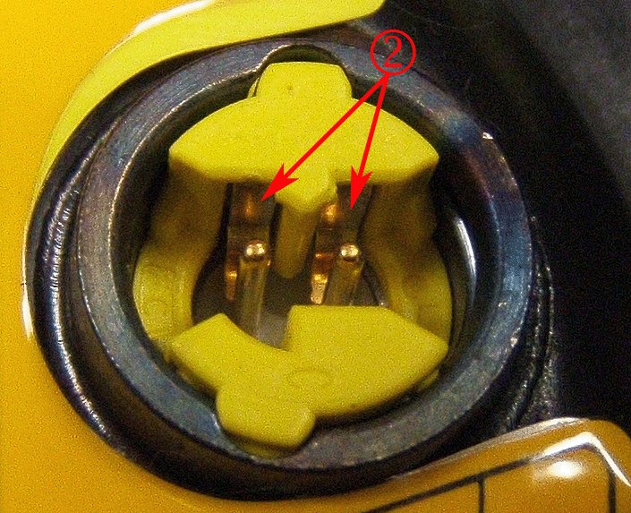 In the photos above you can identify the grounding terminals or shorting bars (2). In all cases the shorting bars appear as a gold plated U-shaped piece of metal on genuine GM airbags. Counterfeit modules (1) often omit these secondary contacts.