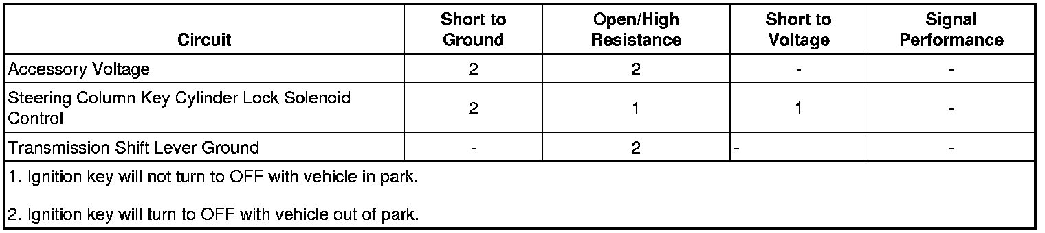 6. With the gear shift selector in any position except the PARK position, verify that a test lamp does not illuminate between the ignition circuit terminal 1 and the control circuit terminal 2.