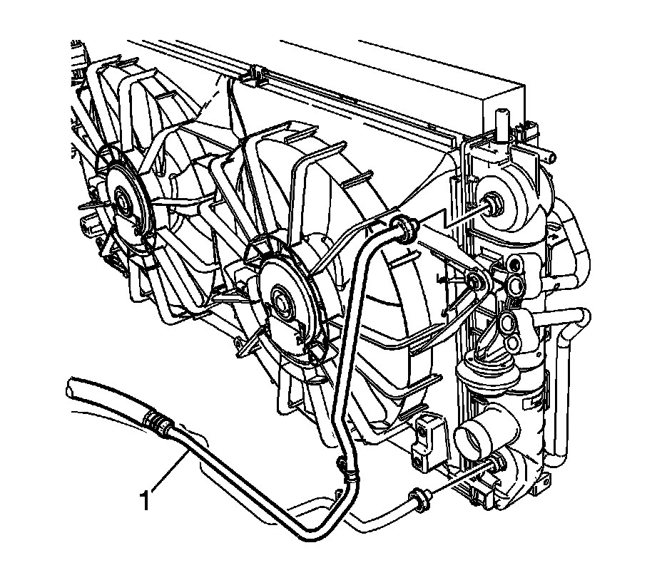 14. Remove the transmission oil cooler lines (1) from the radiator. Refer to Transmission Fluid Cooler Hose/Pipe Quick-Connect Fitting Disconnection and Connection (Transmission Fluid Cooler Hose/Pipe Quick-Connect Fitting Disconnection and Connection).