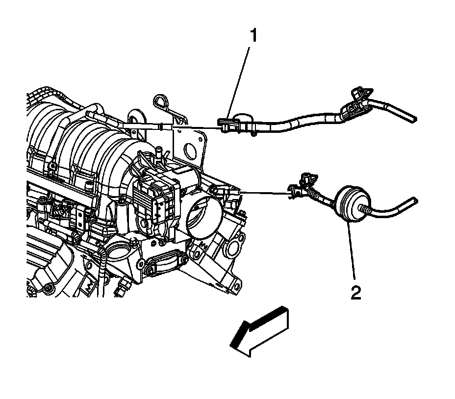 11. Connect the EVAP line (2) quick connect fitting at the EVAP canister purge valve. Refer to Plastic Collar Quick Connect Fitting Service (Plastic Collar Quick Connect Fitting Service).