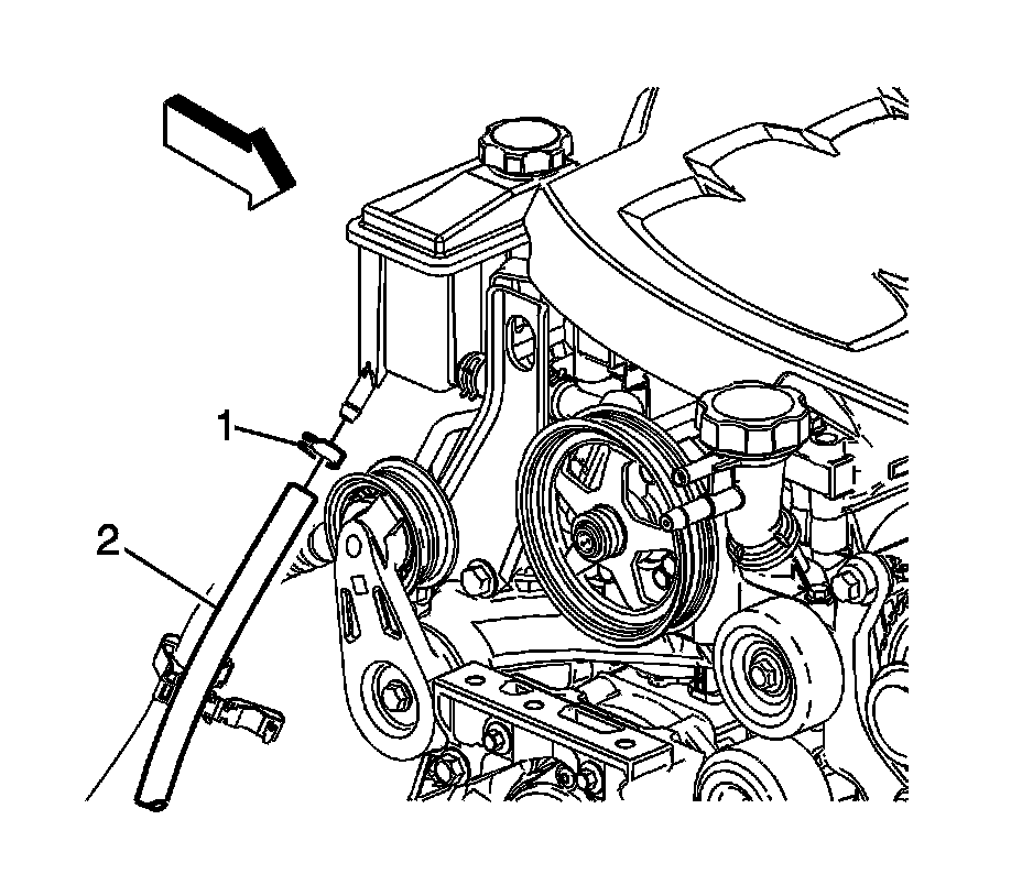 3. Loosen the power steering fluid reservoir inlet hose clamp (1) and disconnect the power steering fluid reservoir inlet hose (2) from the remote power steering fluid reservoir.