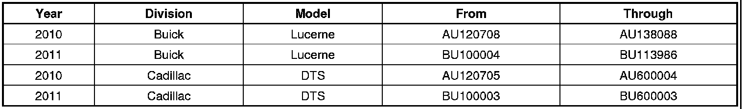 Involved are certain 2010-2011 model year Buick Lucerne vehicles equipped with a V8 engine, and Cadillac DTS vehicles built within these VIN breakpoints:
