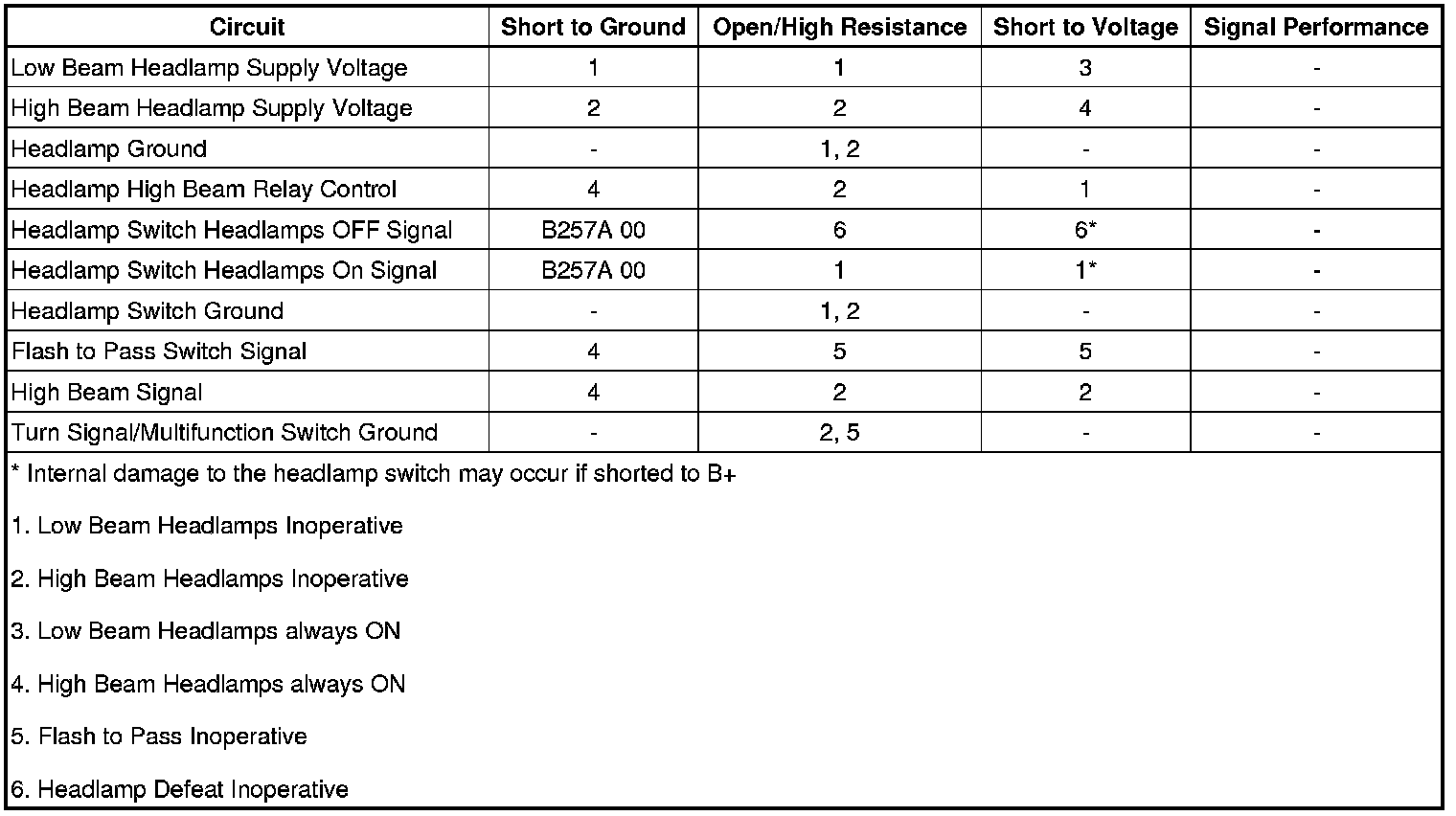 • If the low beam headlamps do not turn ON and OFF when changing between the commanded states, refer to Headlamps Malfunction - Low Beam.