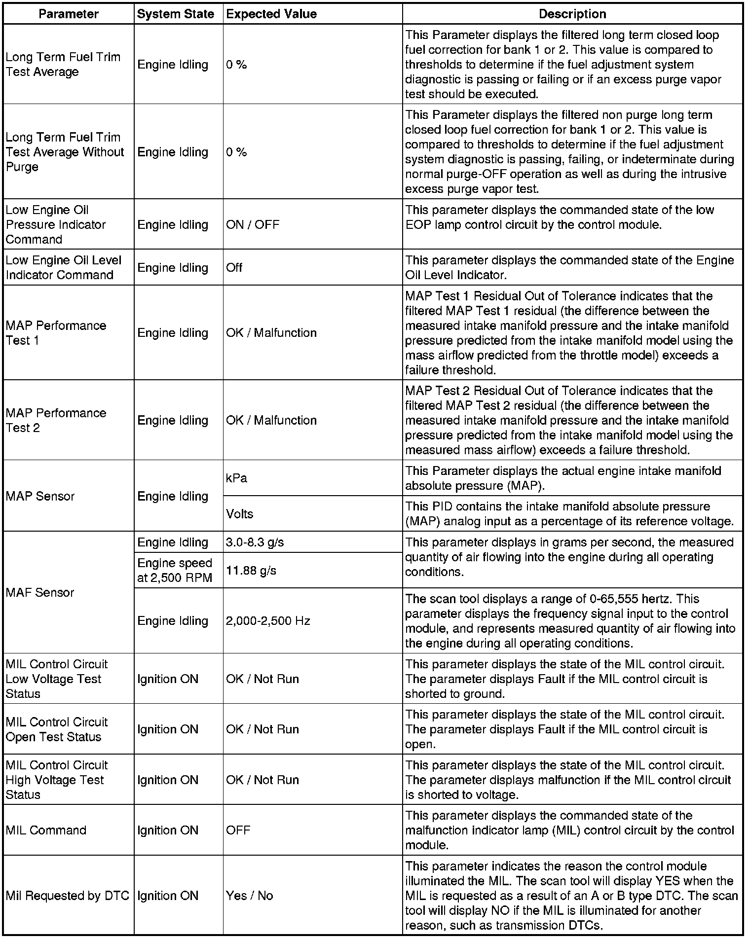 The scan tool values from a properly running engine may be used for comparison with the engine you are diagnosing. The Engine Scan Tool Data List represents values that would be seen on a normally running engine.