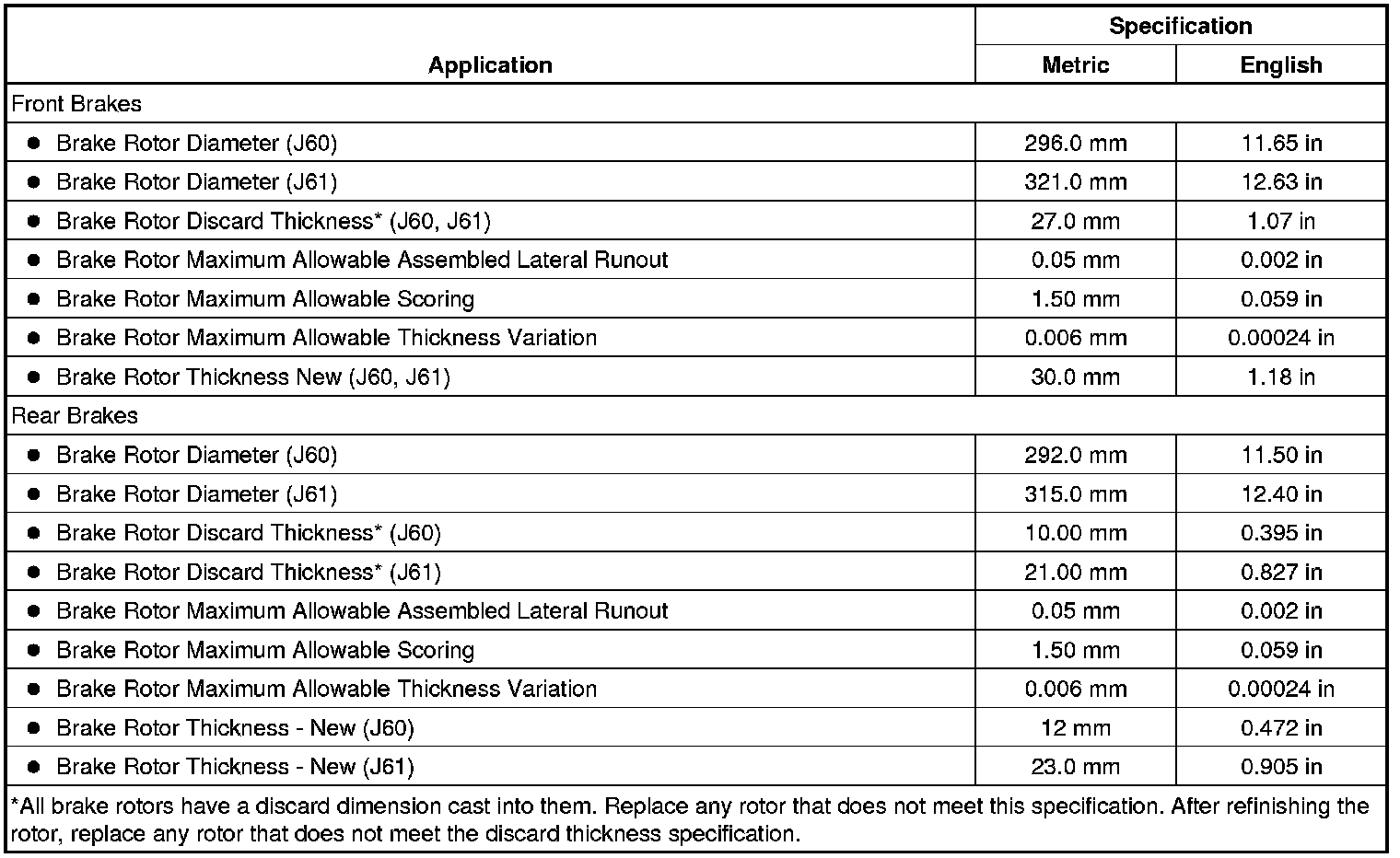 Disc Brake Component Specifications