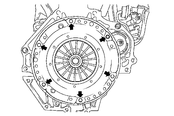 6. Remove thrust plate from flywheel. Remove 6 fasteners.