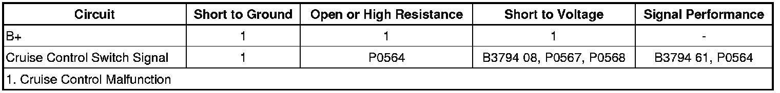 The cruise control switch is an input to the body control module (BCM). The BCM monitors the cruise control on/off, set/coast, resume/accelerate and cancel switches via the cruise control switch signal circuit in order to detect when the driver has requested to perform a cruise control function. The BCM detects a specific voltage signal on the cruise control switch signal circuit when a switch is applied. The BCM sends a serial data message to the engine control module (ECM) indicating the status of the cruise control switches.