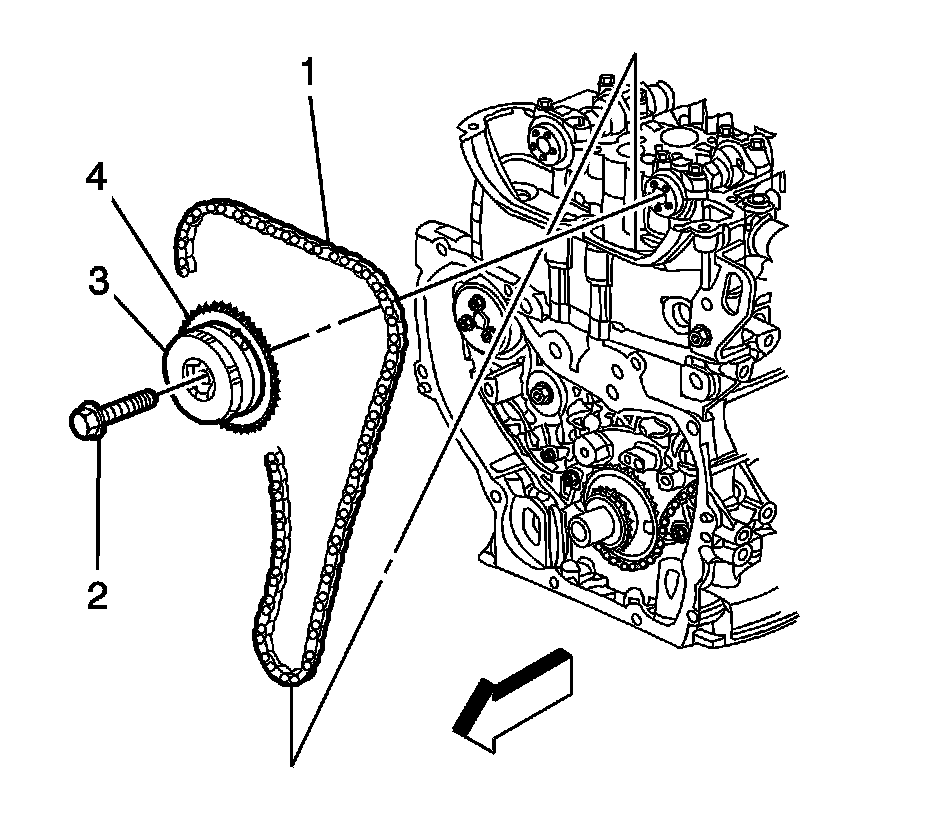 Note: The timing chain tensioner must be removed to unload chain tension before the timing chain is removed. If it is not, the timing chain will become cocked and it will be difficult to remove.