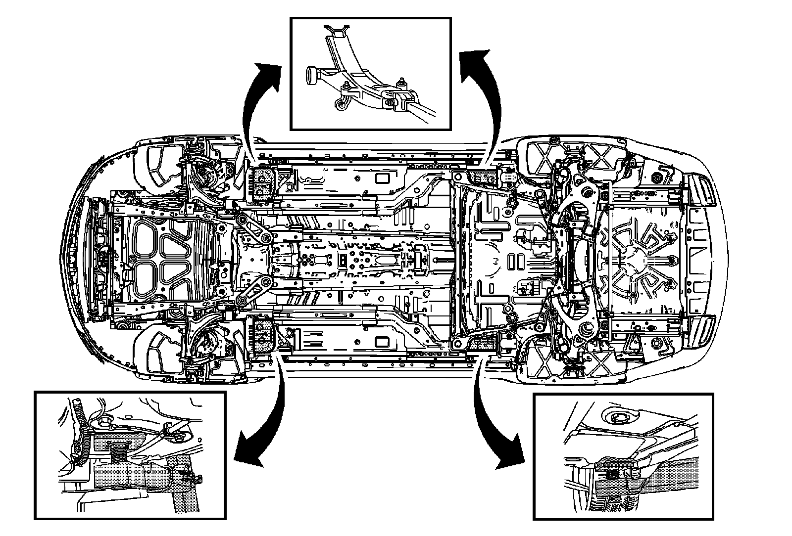 Caution: When you are jacking the vehicle at the front locations, be certain that the jack or the jack lift pad does not contact the front fascia, front fascia air dam, or the front fenders. If such contact occurs, vehicle damage may result. When jacking at selected front locations additional clearance may be required for the jacking points.