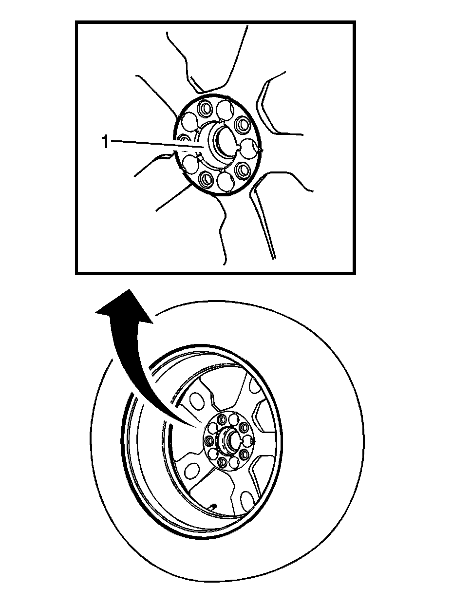 1. Apply a small amount of lubricant to the inner diameter of the wheel hub pilot hole (1) where it contacts the with the wheel bearing/hub flange. Refer to Adhesives, Fluids, Lubricants, and Sealers (Tires and Wheels)
