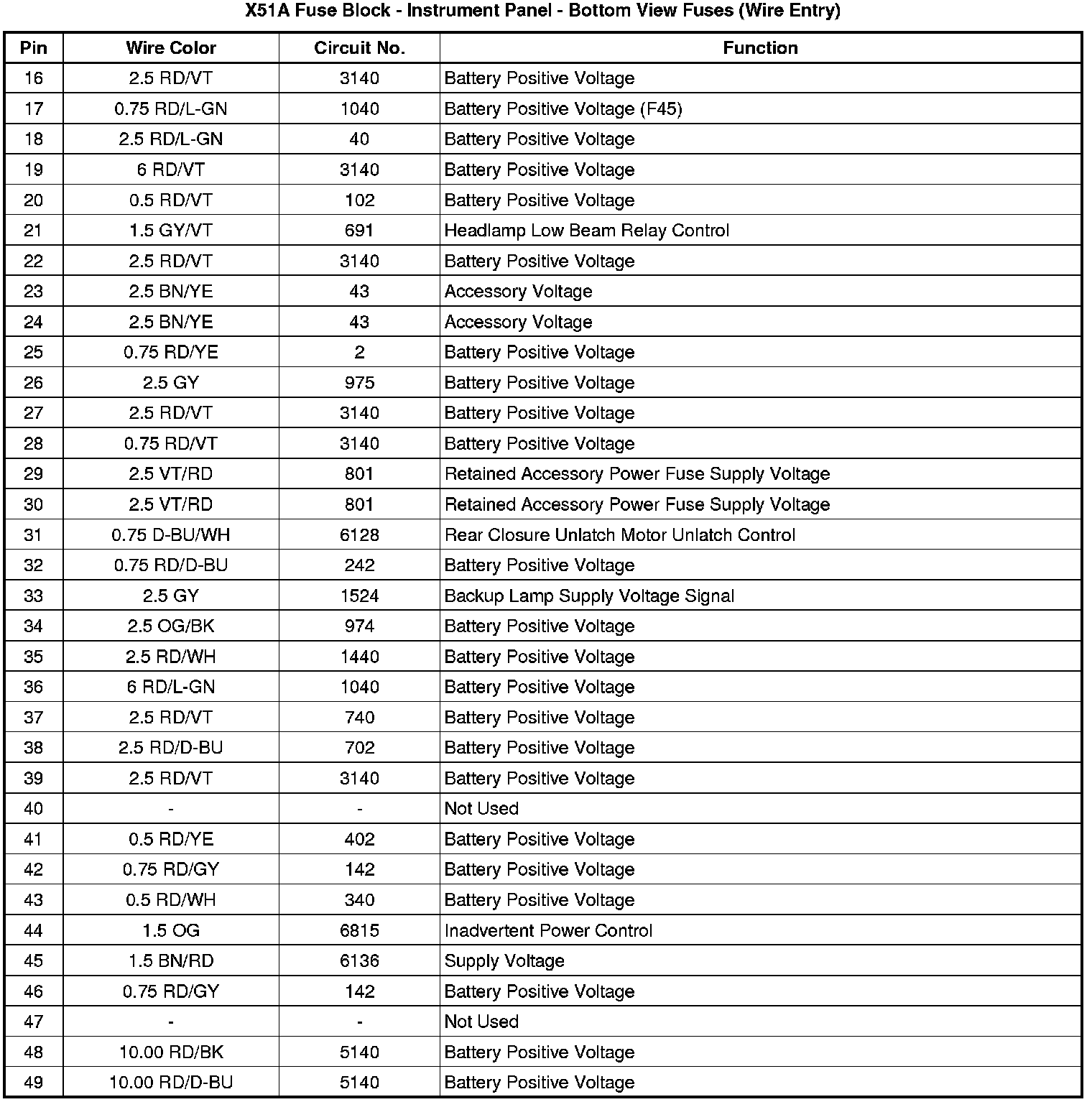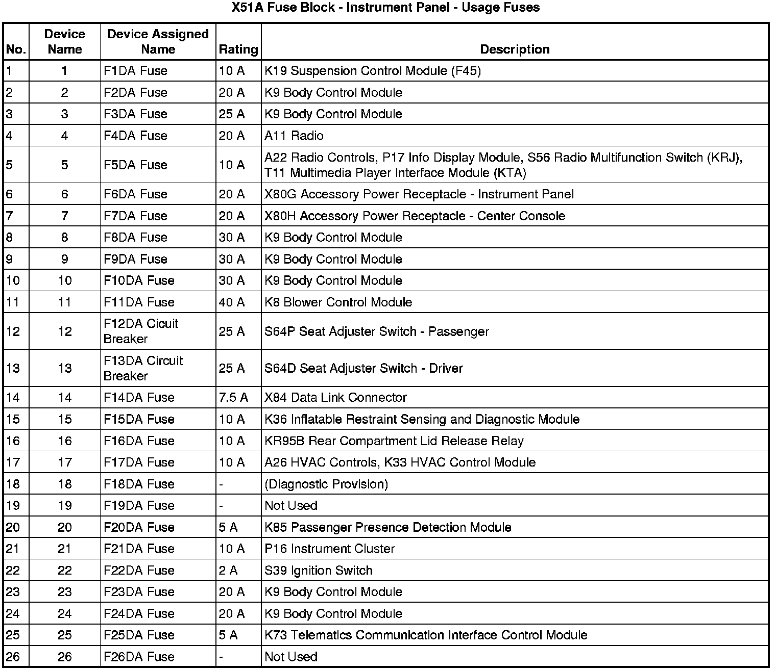 X51A Fuse Block - Instrument Panel - Bottom View Fuses