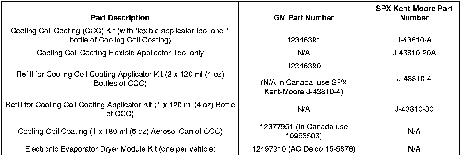 If the Pressure Applicator Spray Tool (J-43810-20A) is not available, the Cooling Coil Coating is also available in an aerosol can (P/N 12377951 (in Canada, 10953503)).