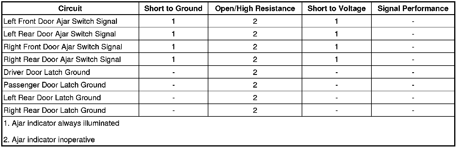 The driver window motor and passenger window motor each receive a discrete input from their respective door ajar switch signal circuits. The body control module (BCM) receives discrete inputs from each of the rear door ajar switch signal circuits. The door ajar switches are integral to each door latch assembly. When a door is opened, the normally open door ajar switch closes. With the door ajar switch closed, ground is provided to the door ajar switch signal circuit. The window motors and/or BCM interprets this and communicates via serial data with the instrument panel cluster.