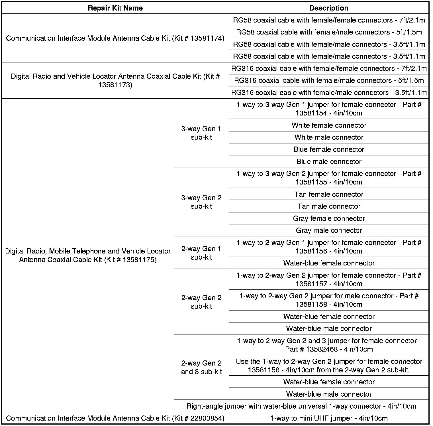 * Communication Interface Module Antenna Cable Kit (Kit # 13581174) is used to repair Cellular coaxial cables. This kit uses RG58 low loss coaxial cables that are available in four lengths. The coaxial cables can be attached together in various lengths to closely match the length of the faulty/damaged coaxial cable.