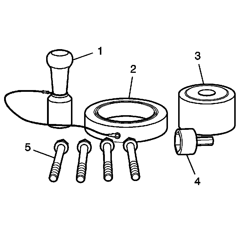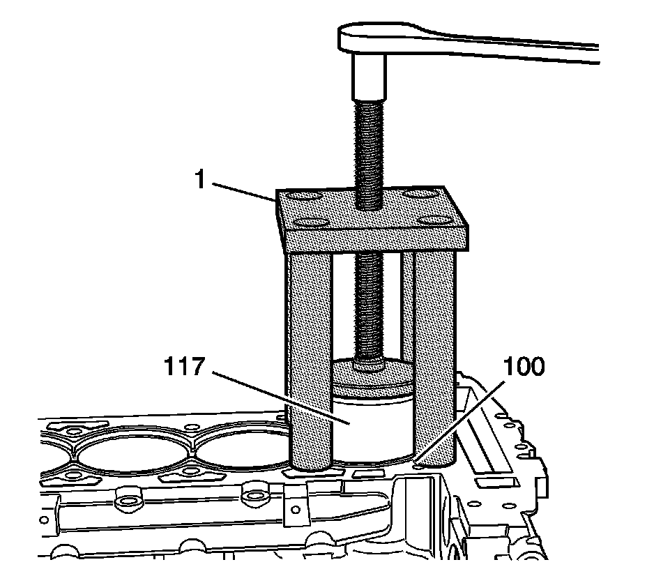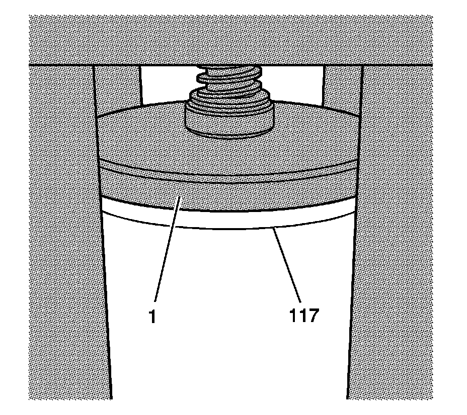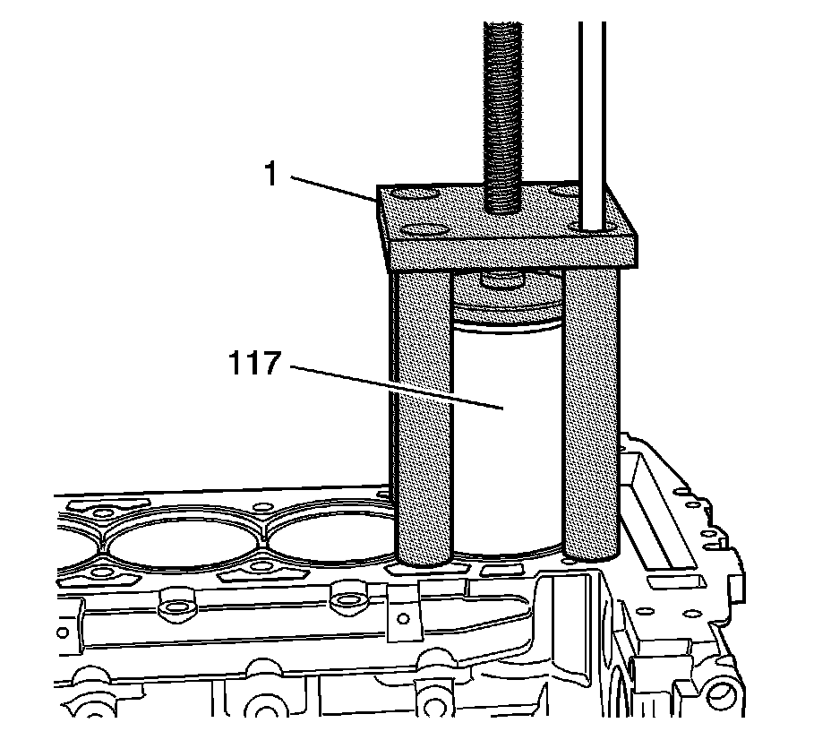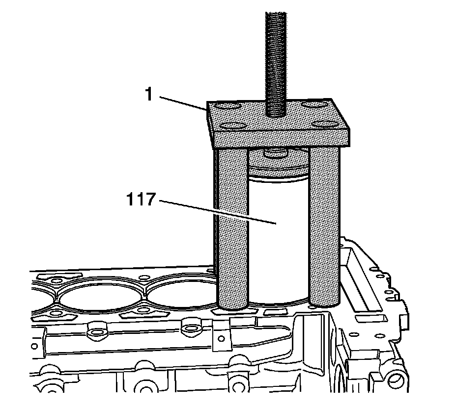2. Install the fixture EN-45680-851 - fixture and the EN-45680-853 - cylinder bore sleeve installer (1) over the cylinder bore sleeve (117) and onto the cylinder block. Do not apply downward pressure to the cylinder bore sleeve (117).