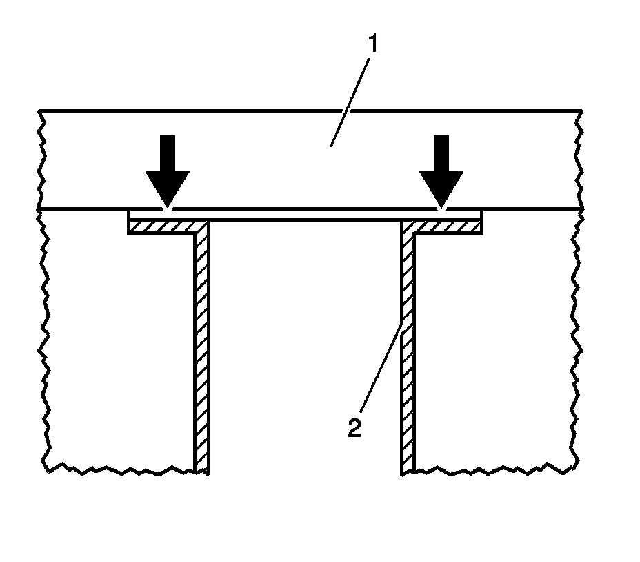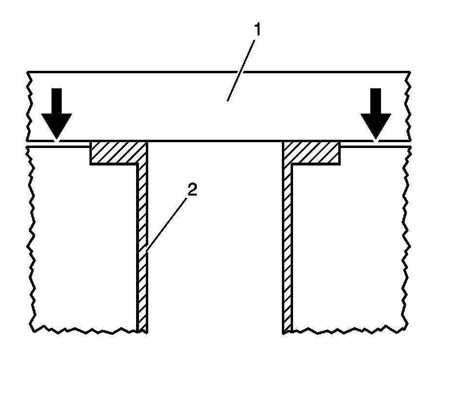 23. Looking at the front of the straight edge (1), check to see if light is protruding through the bottom of the straight edge and the top of the cylinder bore sleeve flange. If light is present on either side or both sides of the cylinder bore sleeve (2), the cylinder bore sleeve is cut incorrectly and a new cylinder bore sleeve needs to be installed.