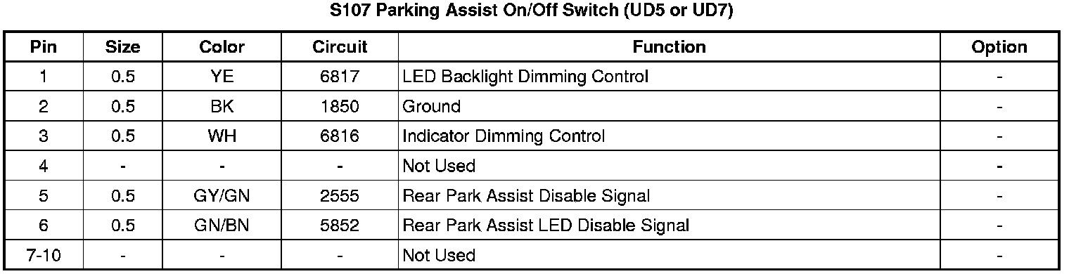 S107 Parking Assist On/Off Switch (UD5 or UD7)