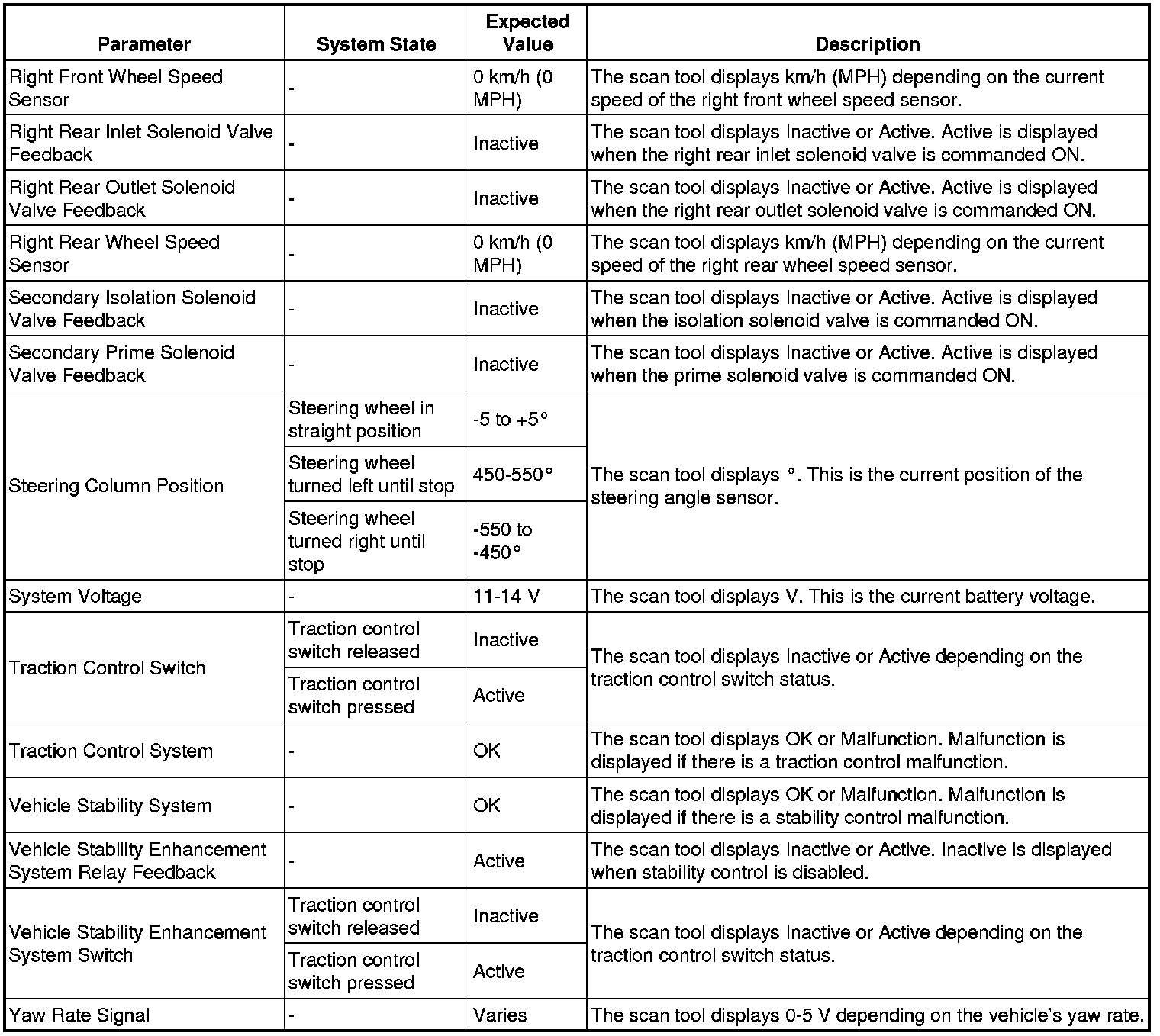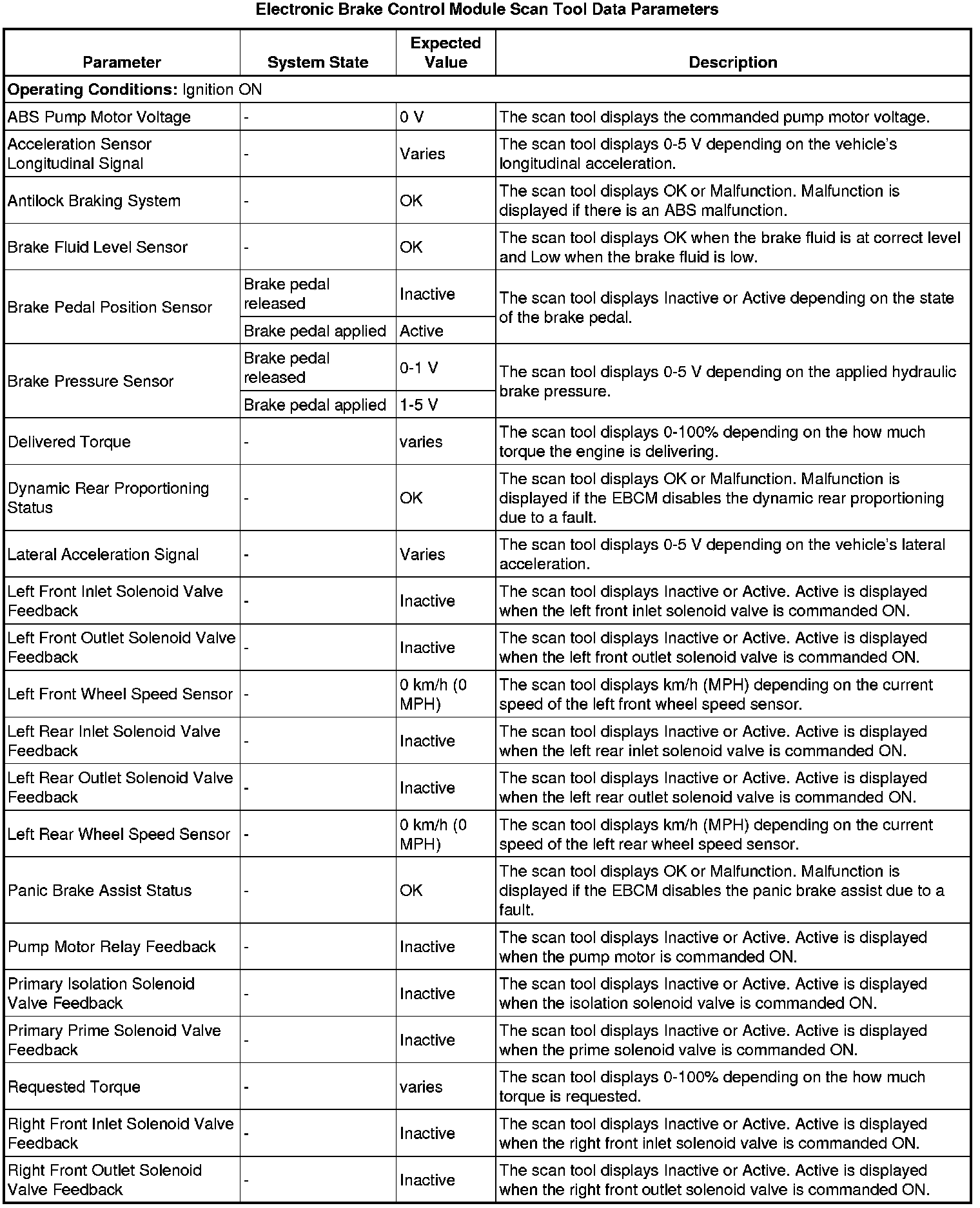 The electronic brake control module (EBCM) scan tool data parameters list contains all ABS related parameters that are available on the scan tool. The list is arranged in alphabetical order. A given parameter may appear in any one of the data lists.