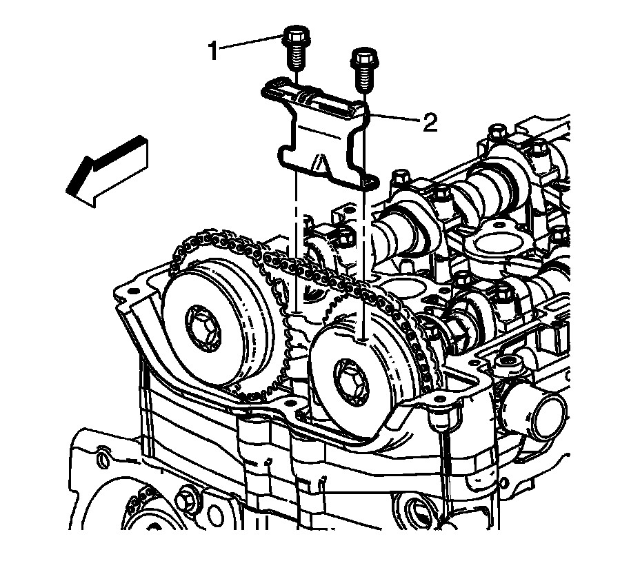 19. Install the upper timing chain guide (2) and bolts (1). Tighten the upper timing chain guide bolts to 10 Nm (89 lb in).