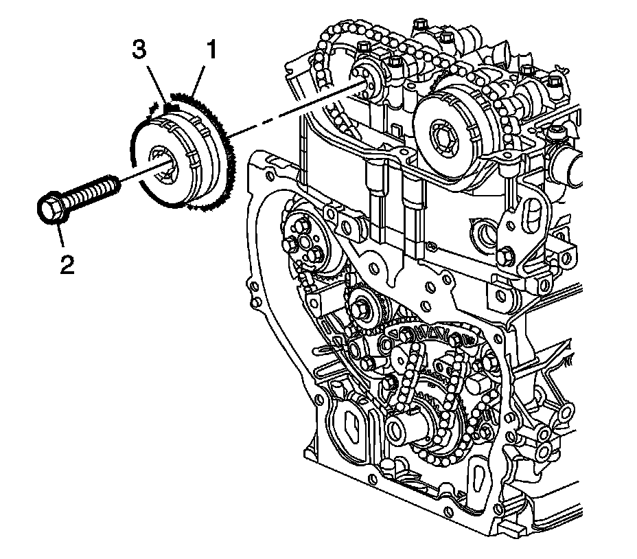 9. Remove the exhaust camshaft actuator (1, 3) from the camshaft and timing chain.