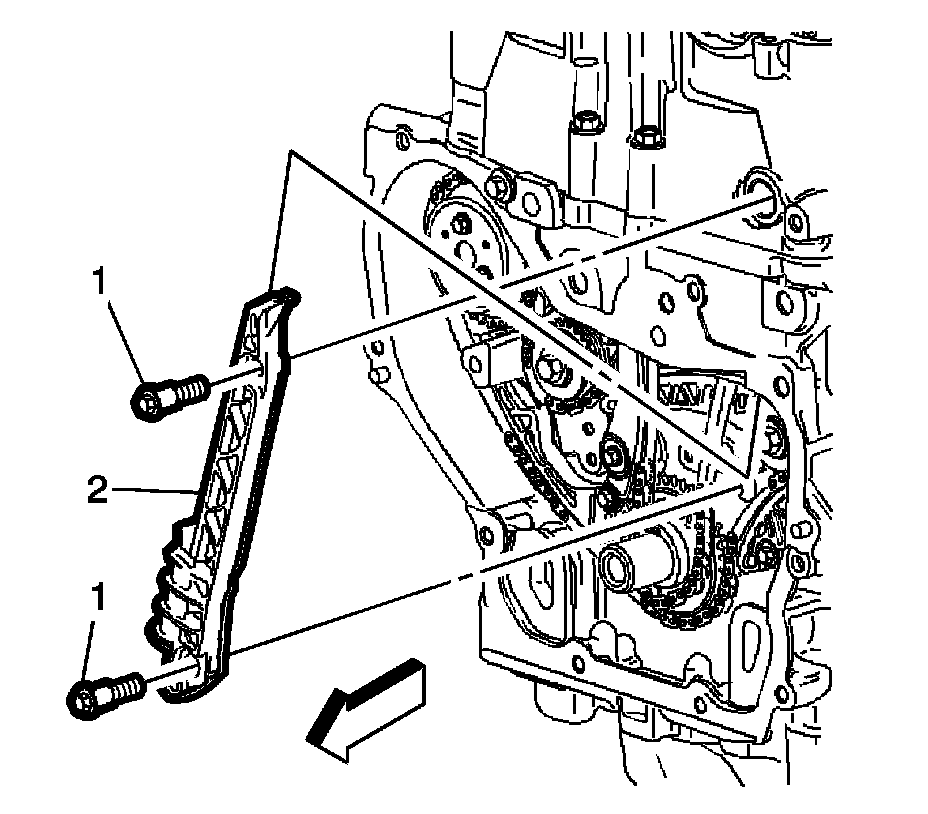 18. Install the fixed timing chain guide (2) and bolts (1). Tighten the fixed timing chain guide bolts to 12 Nm (106 lb in).
