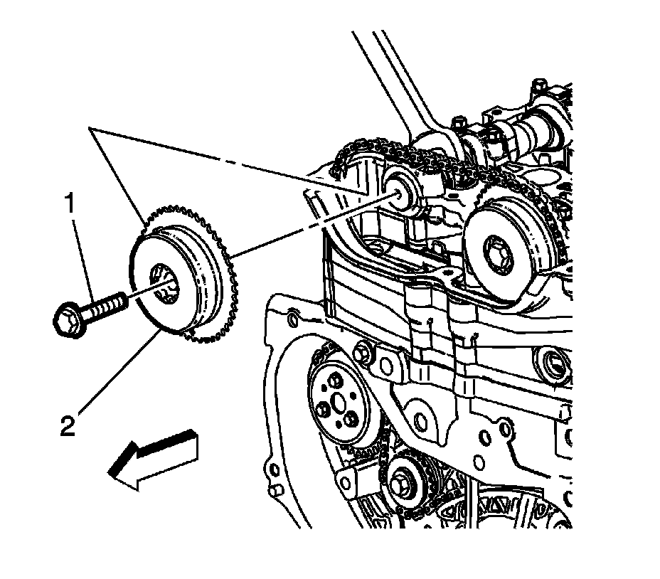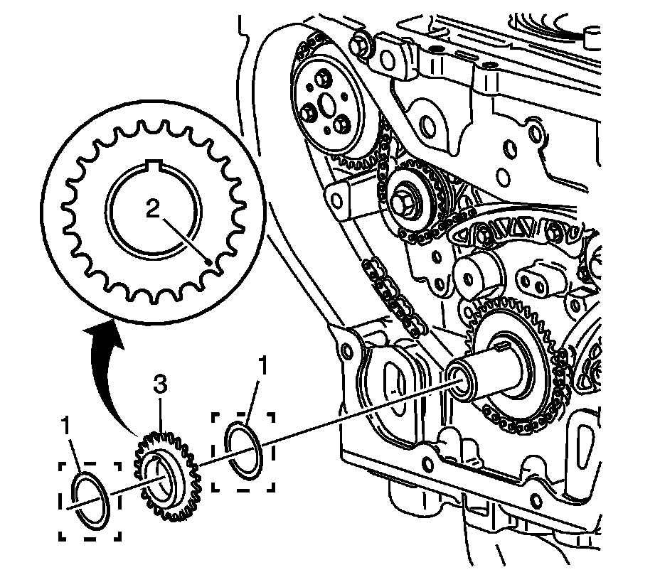 Note: Ecotec 4 cylinder engines with SIDI-Direct Injection, the lower timing chain crank gear may be equipped with a second spacing washer installed in front of the lower timing chain crank gear. The outer spacer/washer is in between the crank/balancer pulley and the lower timing gear and may remain in place when the pulley is removed. The spacer/washer has a dot/mark on its surface that may be mistaken for the lower timing mark. If applicable, the washer must be removed in order to view the correct timing mark on the lower crank gear.
