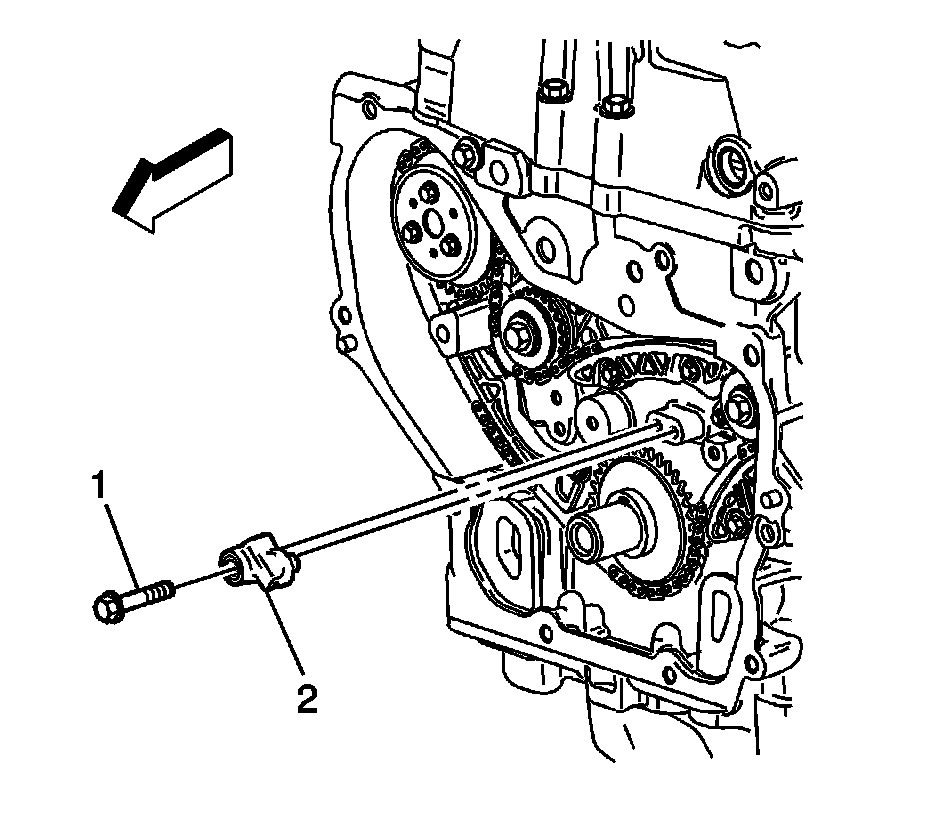 12. Install the adjustable timing chain guide (2) down through the opening in the cylinder head and install the adjustable timing chain bolt. Tighten the adjustable timing chain guide bolt (1) to 10 Nm (89 lb in).