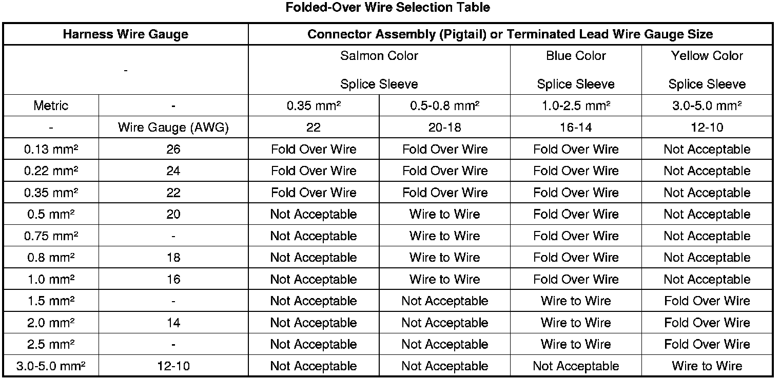 The folded over wire repair technique, in which the copper wire strands are folded over before being installed into a splice sleeve, allows the service part to be used when repairing a smaller gauge size wire in a vehicle. This technique has passed all GM testing standards.