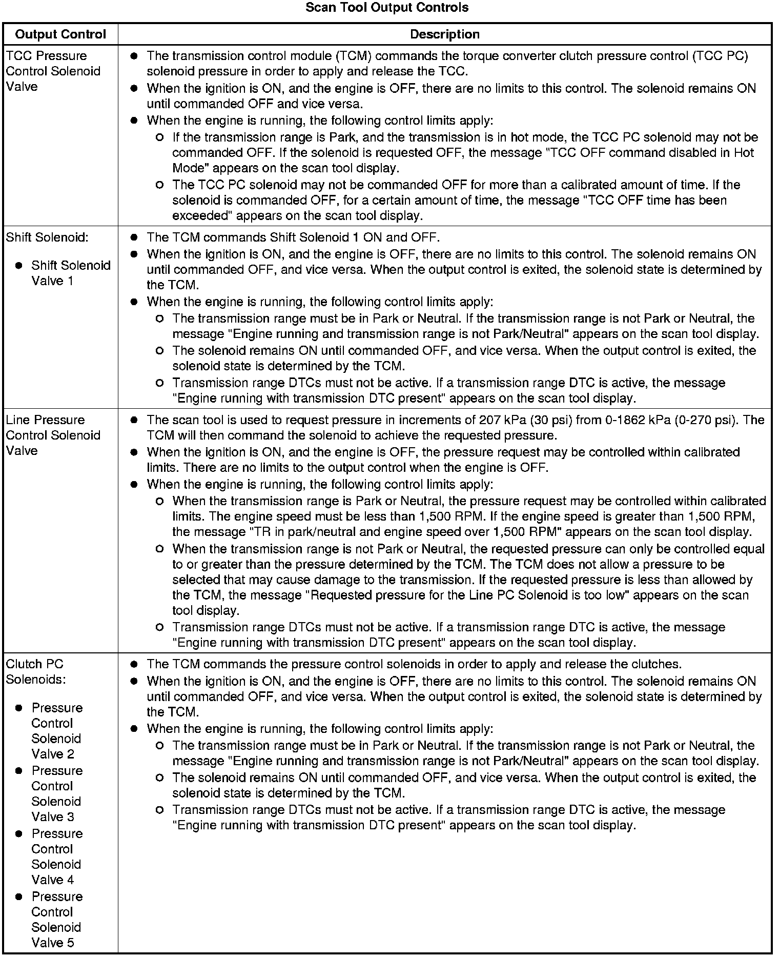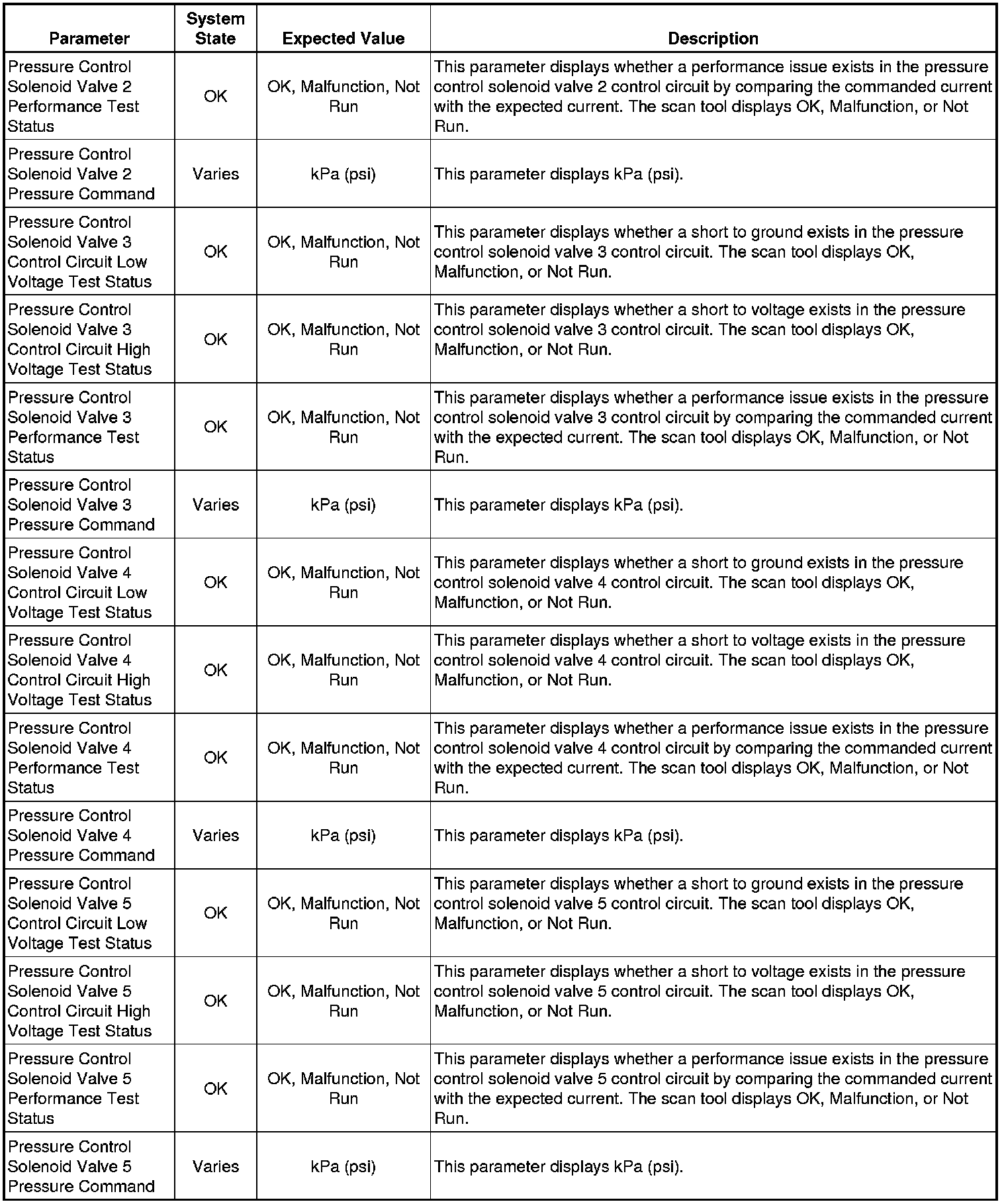The Transmission Control Module Scan Tool Data List contains all transmission related parameters that are available on the scan tool. The list is arranged in alphabetical order. A given parameter may appear in any one of the data lists, and in some cases may appear more than once, or in more than one data list in order to group certain related parameters together.