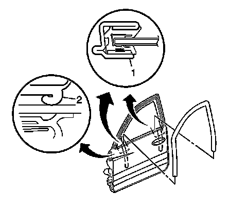 * The window run channel outboard lip at the rearview mirror is rolled over or the window run channel outboard lip at the rear of door frame (2).