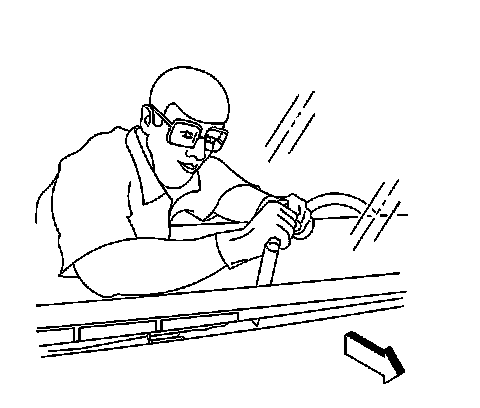 10. Remove the bottom of the windshield from the urethane adhesive using a long utility knife or similar tool. Keep the cutting edge of the utility knife against the glass. Do this from inside the vehicle.